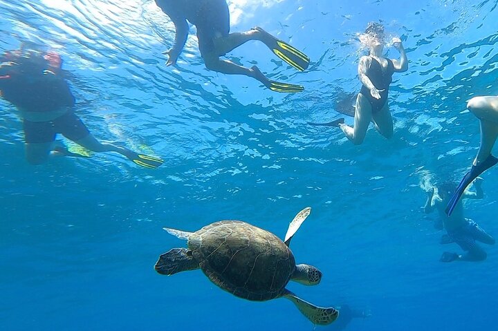 An area within the snorkeling location where participants have the opportunity to encounter sea turtles swimming freely and learn about their importance in the reef ecosystem.